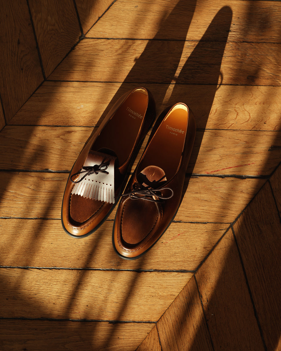 Cognac brown shoes with fringe by Timothée Paris worn with creme pants and a brown coat on a beige background